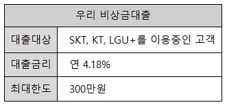 우리은행 우리 비상금대출은 통신3사인 SKT, KT, LG U+를 이용중인 고객이라면 통신등급이 산출되는 고객이라면 이용할 수 있습니다.