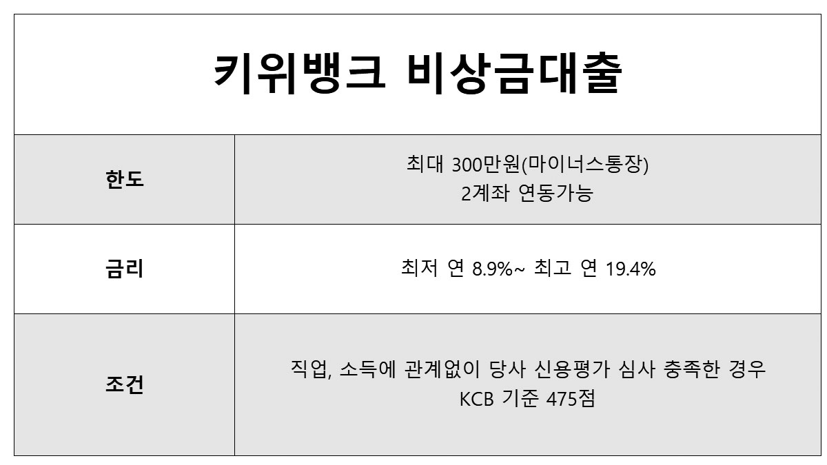 키위뱅크 비상금대출은 KCB기준 475점 이상이라면 재직, 소득 증빙없이 신청할 수 있는 상품입니다.