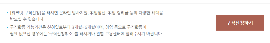 나의 구직신청정보를 입력한다음 구직신청을 합니다. 구직신청을하면 온라인입사지원, 취업알선, 취업장려금과 같은 다양한 혜택이 있습니다. 신청일로부터 3개월간 지속됩니다.