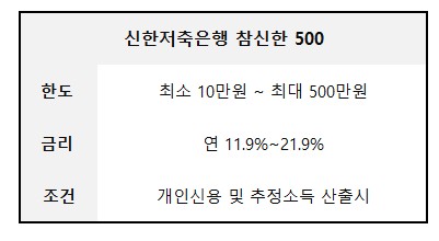 신한저축은행 참신한 500 상품은 추정소득이 산출될 시에 한도가 부여되는 상품으로 재직여부와 상관없이 신청이 가능합니다.