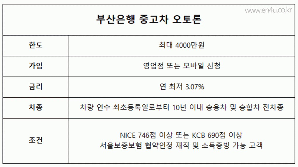 부산은행 중고차대출 상품은 [BNK 중고차 오토론]은 영업점 가입이 가능하며 스마트폰 가입 여부는 확인이 필요합니다.