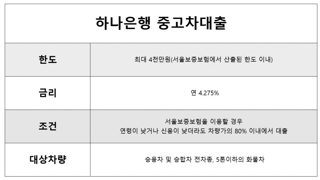 하나은행 중고차대출 한도는 최대 4천만원이며 차량판매가격 이내에서 서울보증보험 한도 내 대출이 가능합니다.