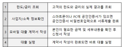 국세청 홈택스에 등록된 개인사업자라면 공인인증서 인증만으로 모든 서류제출이 완료되며 완료시점으로 부터 모바일로 즉시 대출이 가능하기 때문에 급하게 돈이 필요한 개인사업자를 위한 상품입니다.